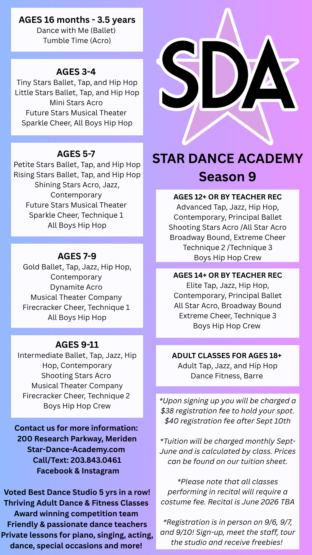 Ballet is the foundation for training and focuses on developing a solid ballet technique. Through choreography and technique, students will learn correct body placement, advanced coordination, discipline, balance, and the fundamentals of dance. Classes are offered for all ages: Dance With Me, Tiny/Little Stars, Petite/Rising Stars, Gold Stars, Intermediate and Principal Ballet.
